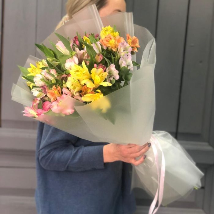 Альстромерия – 15 шт.Упаковка дизайнерская – 4 шт.Лента атласная – 2 шт.