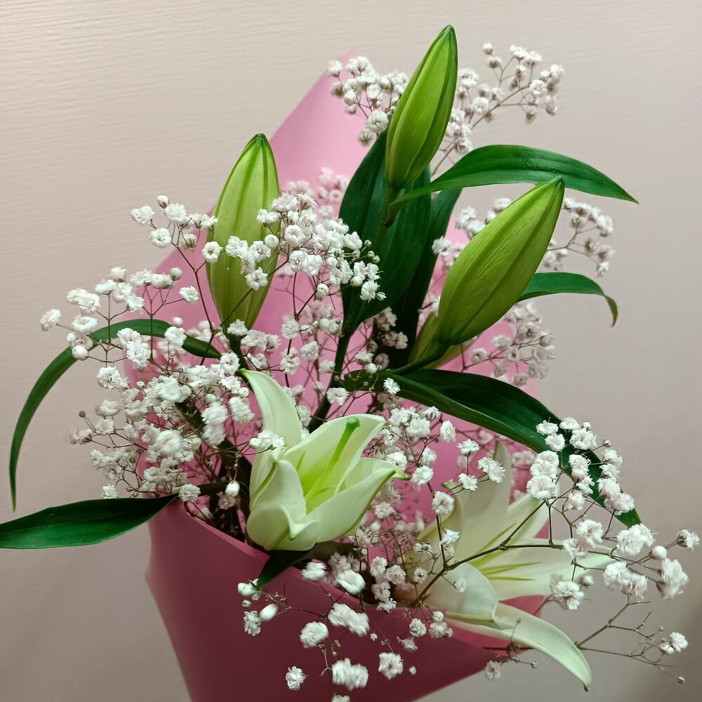 Упаковка – 1 шт.Лилия белая – 1 шт.Гипсофила розовая – 1 шт.