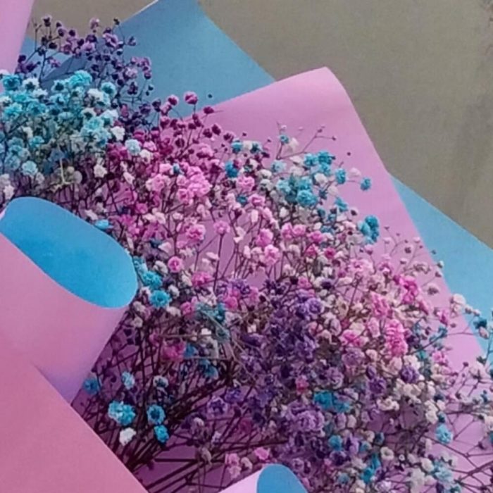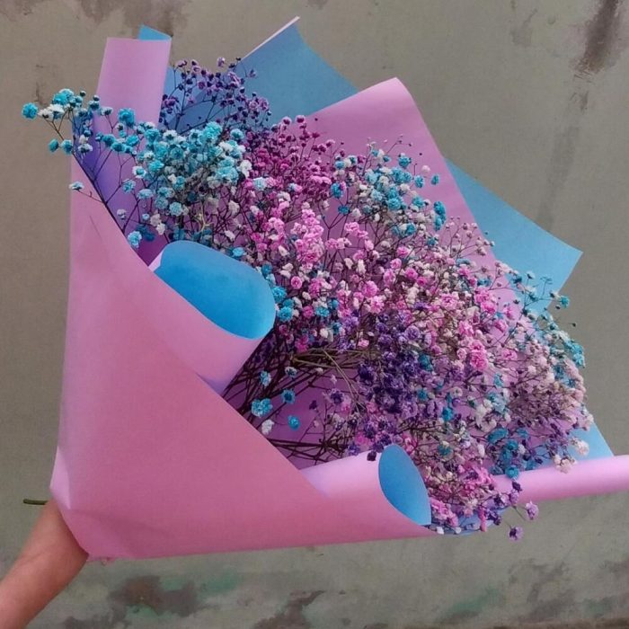 Лента – 1 шт.Упаковка дизайнерская – 7 шт.гипсофила радужная – 9 шт.