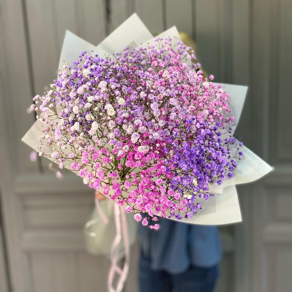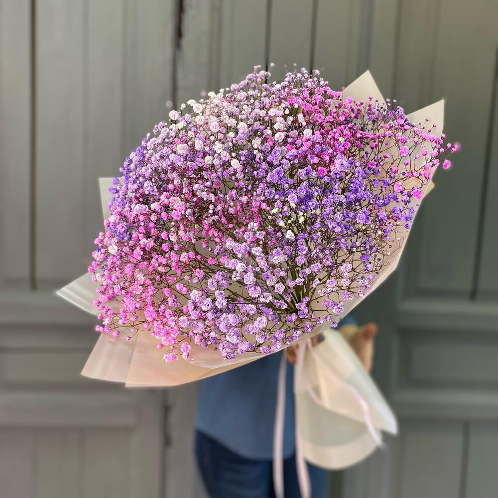 Гипсофила – 9 шт.Упаковка дизайнерская – 4 шт.Лента атласная – 1 шт.