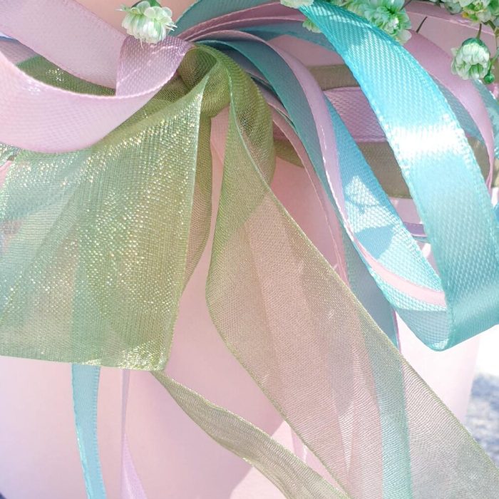 Гипсофила – 8 шт.Лента атласная – 3 шт.Коробка шляпная – 1 шт.Открыточка с вашими пожеланиями – 1 шт.Оазис флористический – 1 шт.