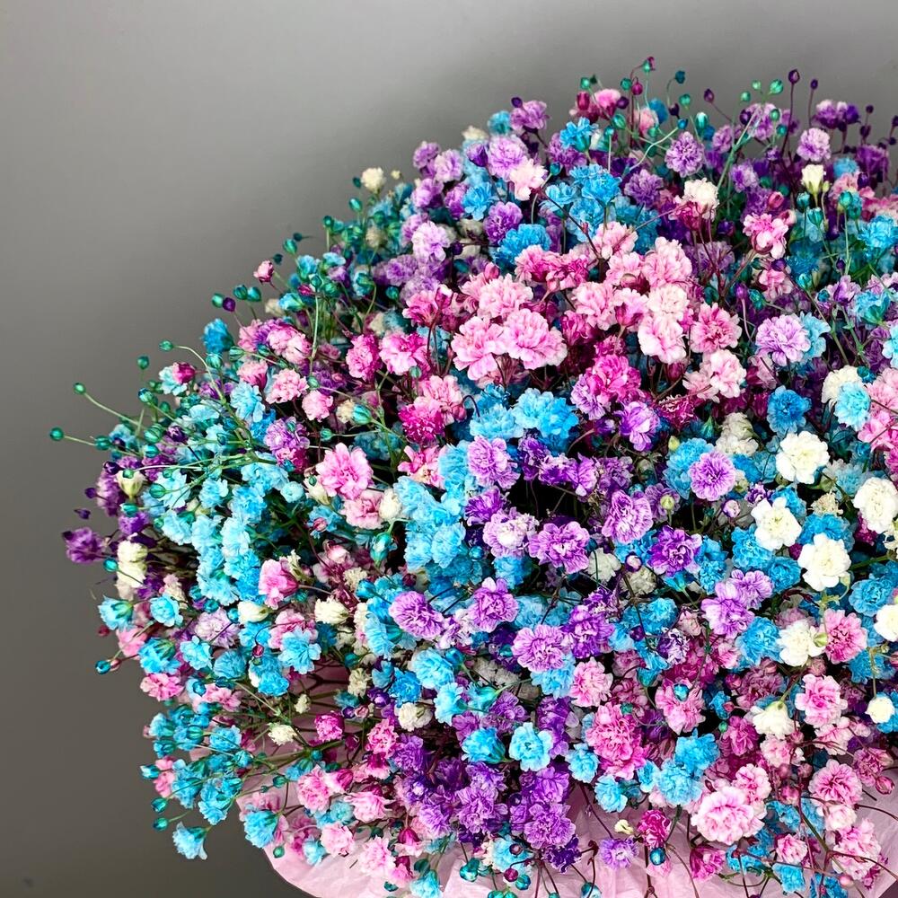 Лента атласная – 2 шт.Тишью – 2 шт.Коробка шляпная – 1 шт.Пленка прозрачная – 1 шт.Оазис флористический – 1 шт.гипсофила радужная – 9 шт.