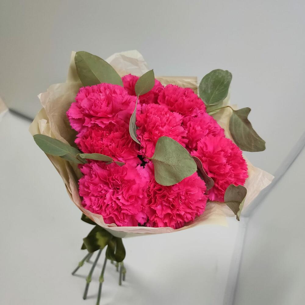 Букет из 9 гвоздик малиновых с эвкалиптом
