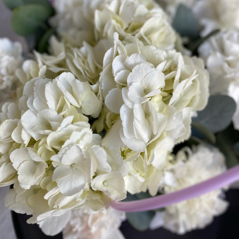 Гортензия с белыми диантусами и эвкалиптом