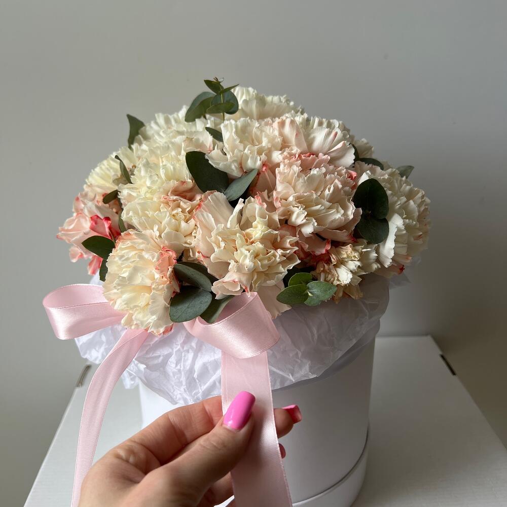 Гвоздика – 25 шт.Лента атласная – 1 шт.Оазис – 1 шт.Шляпная коробка – 1 шт.