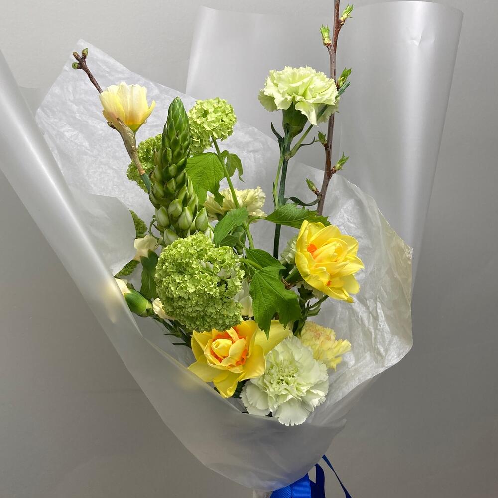 Вибурнум – 1 шт.Нарцисс – 3 шт.Гвоздика – 5 шт.Орнитогалум – 1 шт.Гвоздика кустовая – 1 шт.Прунус – 2 шт.