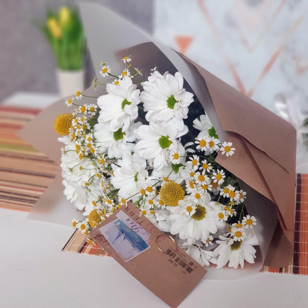 Лента атласная – 1 шт.Ромашка кустовая – 4 шт.Крафт упаковка – 1 шт.Пленка матовая – 1 шт.Открыточка с вашими пожеланиями – 1 шт.Хризантема кустовая белая бакарди – 3 шт.Краспедия желтая – 3 шт.держатель для открыток железный – 1 шт.