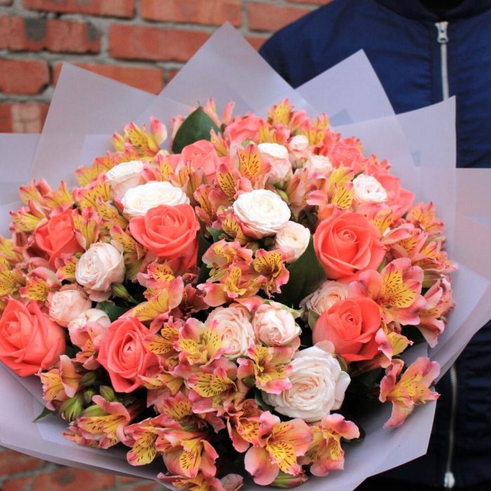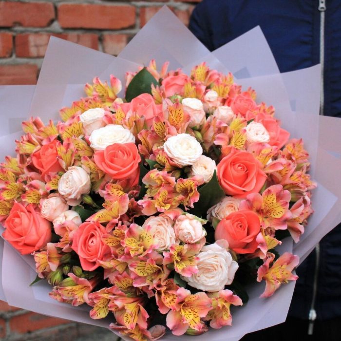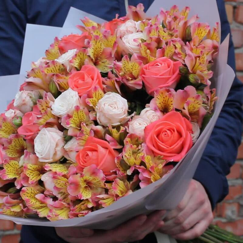 Альстромерия – 20 шт.Рускус – 7 шт.Лента атласная – 1 шт.Роза кустовая пионовидная – 5 шт.упаковочный материал – 3 шт.роза жиардина – 10 шт.