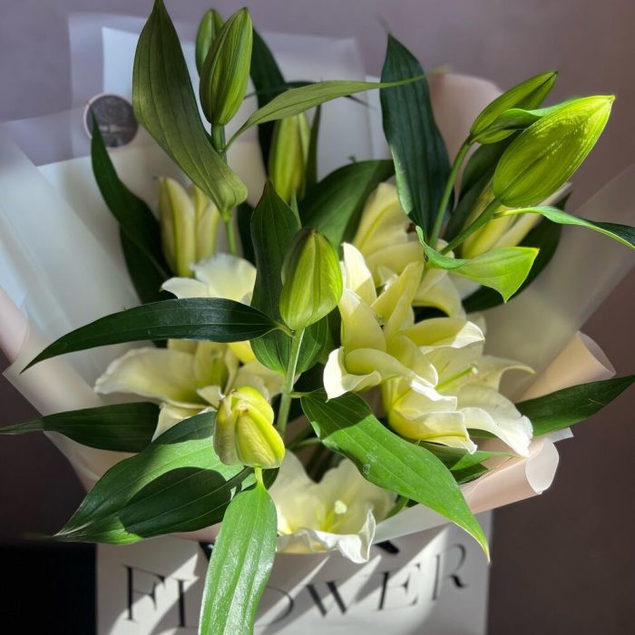 Лилия – 3 шт.Атласная лента – 1 шт.декоративная упаковка – 1 шт.
