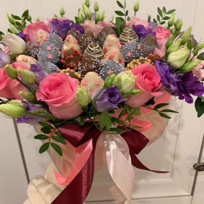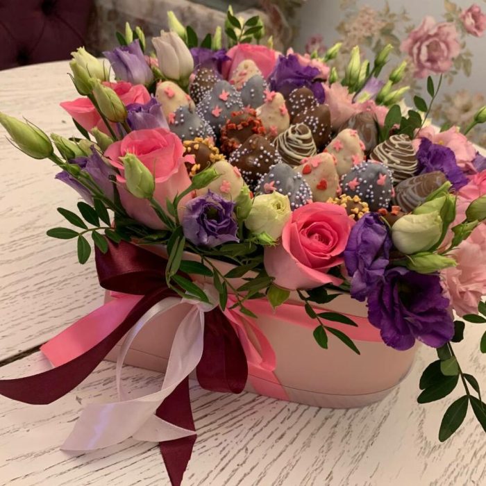 Лизиантус – 5 шт.клубника в бельгийском шоколаде – 23 шт.транспортировочная пленка – 1 шт.розы розовые – 5 шт.коробка сердцк – 1 шт.