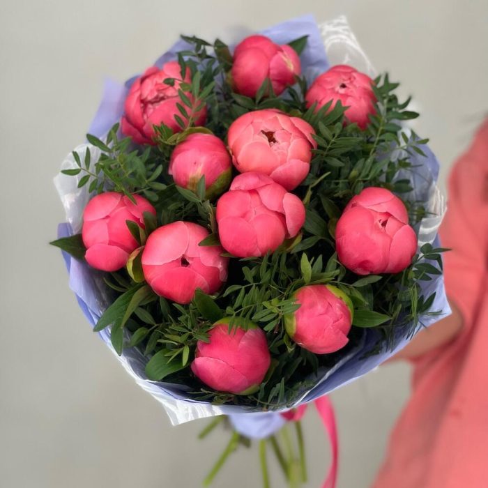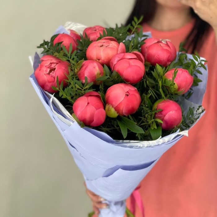 Упаковка – 2 шт.Лента атласная – 1 шт.Фисташка – 5 шт.Пион коралл шарм – 11 шт.