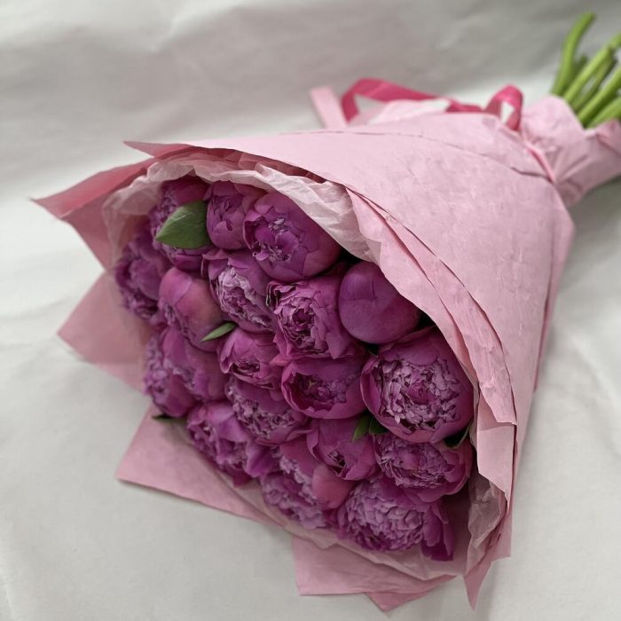 Пион – 23 шт.Дизайнерская упаковка – 1 шт.Атласная лента – 1 шт.открыточка – 1 шт.