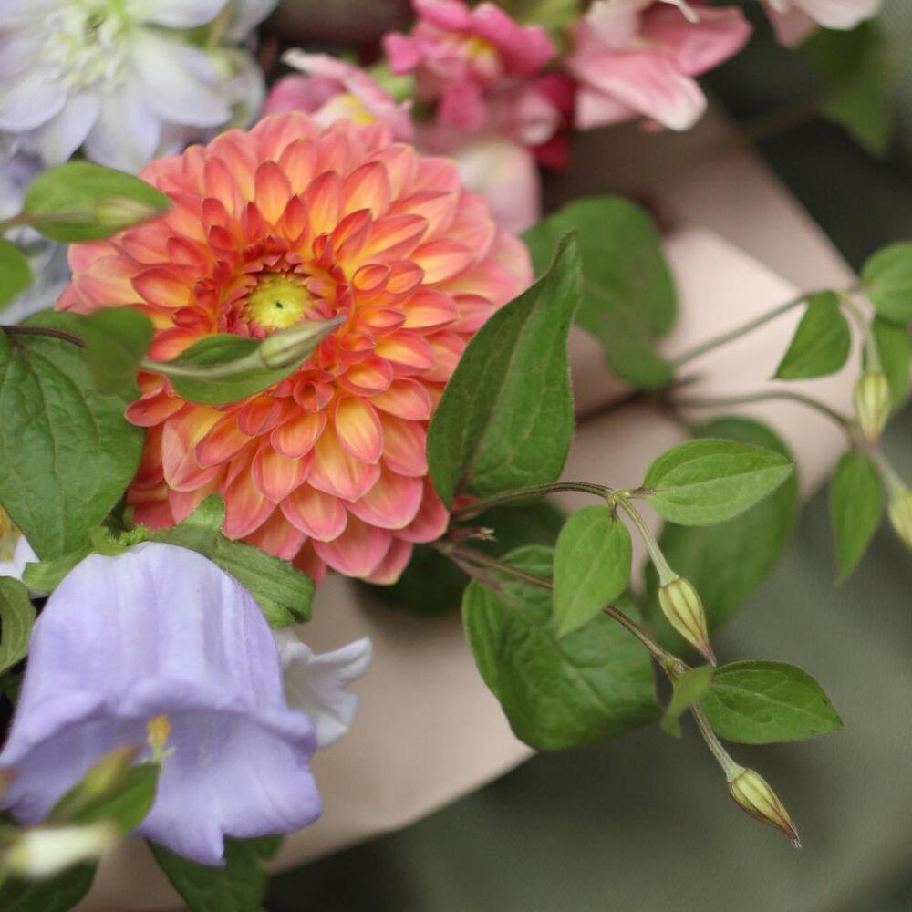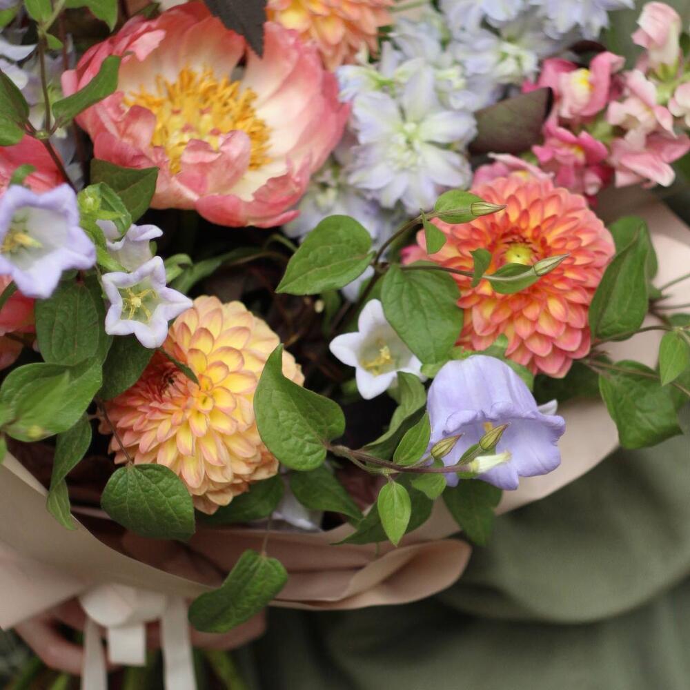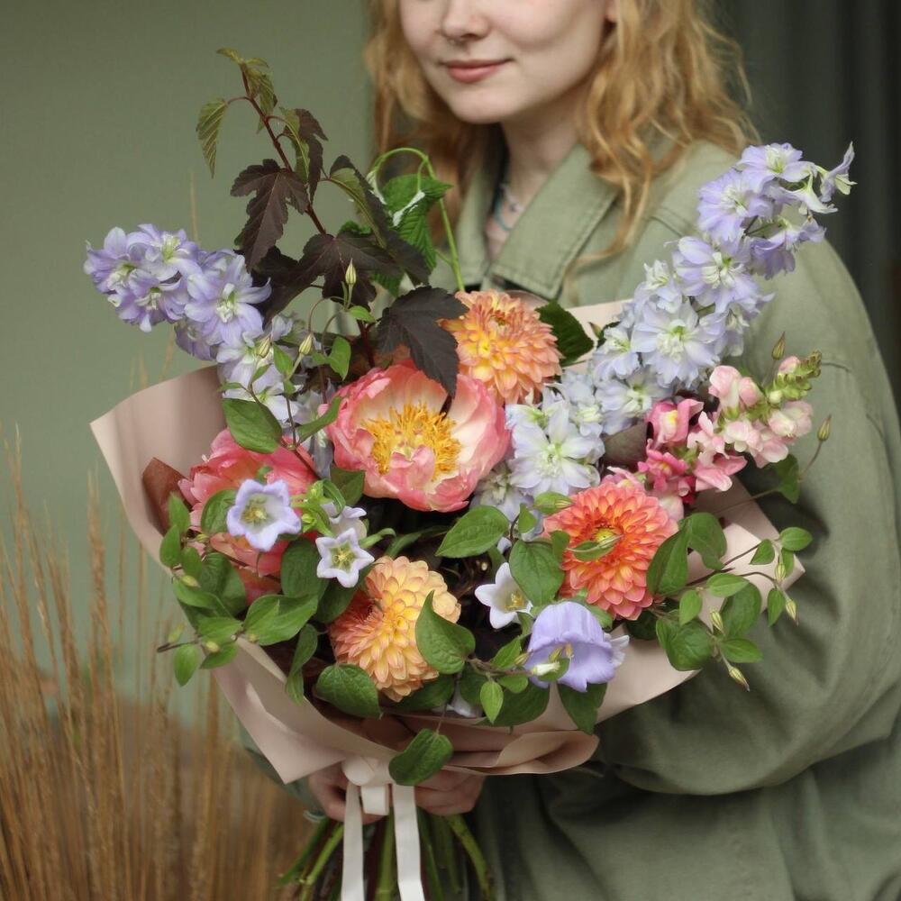 Дельфиниум – 3 шт.Георгина – 3 шт.Пион – 2 шт.Колокольчик – 2 шт.пузыреплодник – 2 шт.малина ветки – 2 шт.Львиный зев – 1 шт.Клематис – 1 шт.Упаковка – 1 шт.
