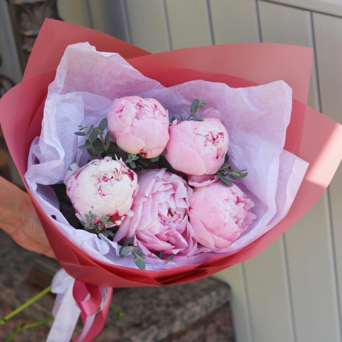 Эвкалипт – 1 шт.Пион Сара Бернар – 5 шт.Открыточка с вашими пожеланиями – 1 шт.Дизайнерская упаковка – 1 шт.