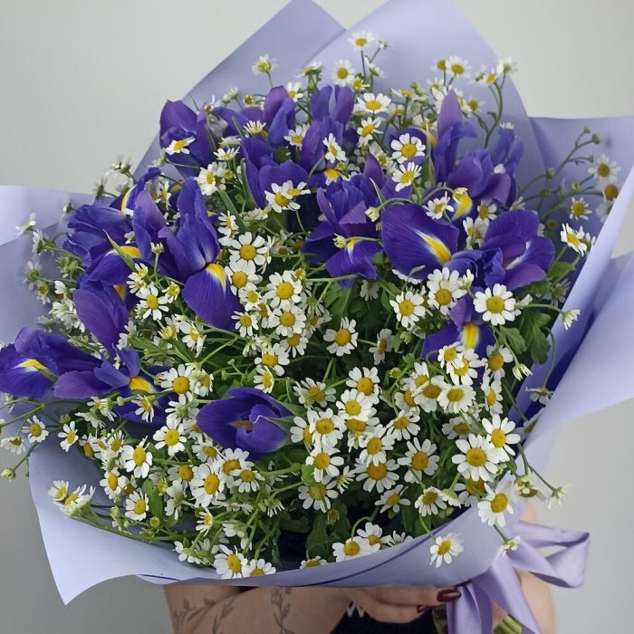 Матрикария (ромашка) – 19 шт.Ирис Blue Magic – 10 шт.Пленка матовая – 2 шт.Лента – 1 шт.