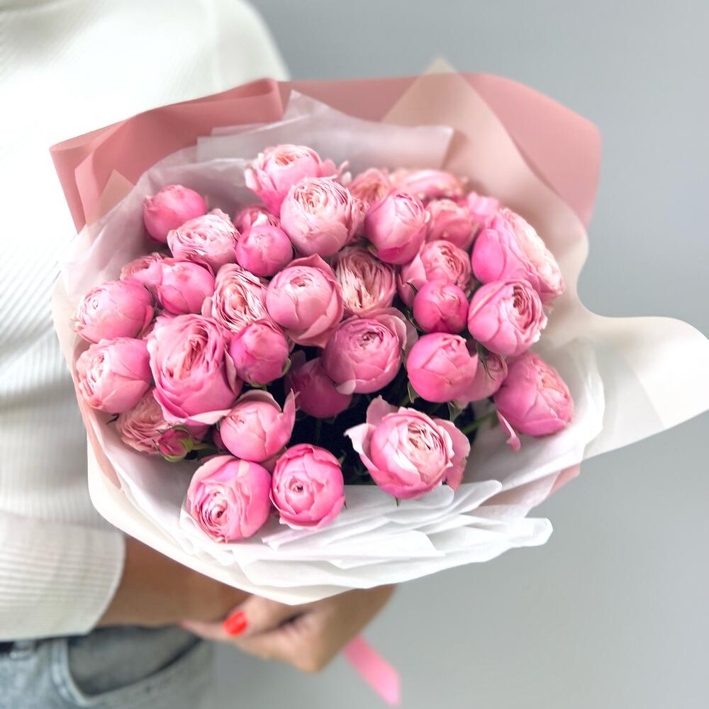 Лента атласная – 1 шт.Упаковка дизайнерская – 2 шт.Пионовидная кустовая роза – 9 шт.Тишью белое – 3 шт.