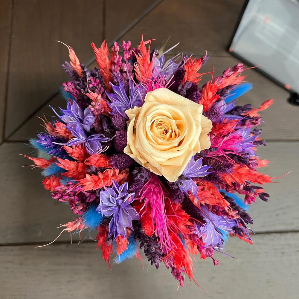 Роза стабилизированная – 1 шт.Пшеница (сухоцвет) – 30 гр.Лагурус (сухоцвет) – 30 гр.Лаванда (сухоцвет) – 20 гр.