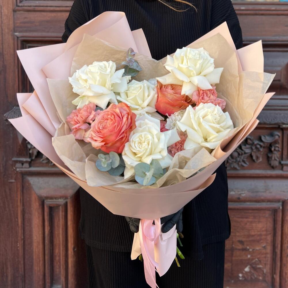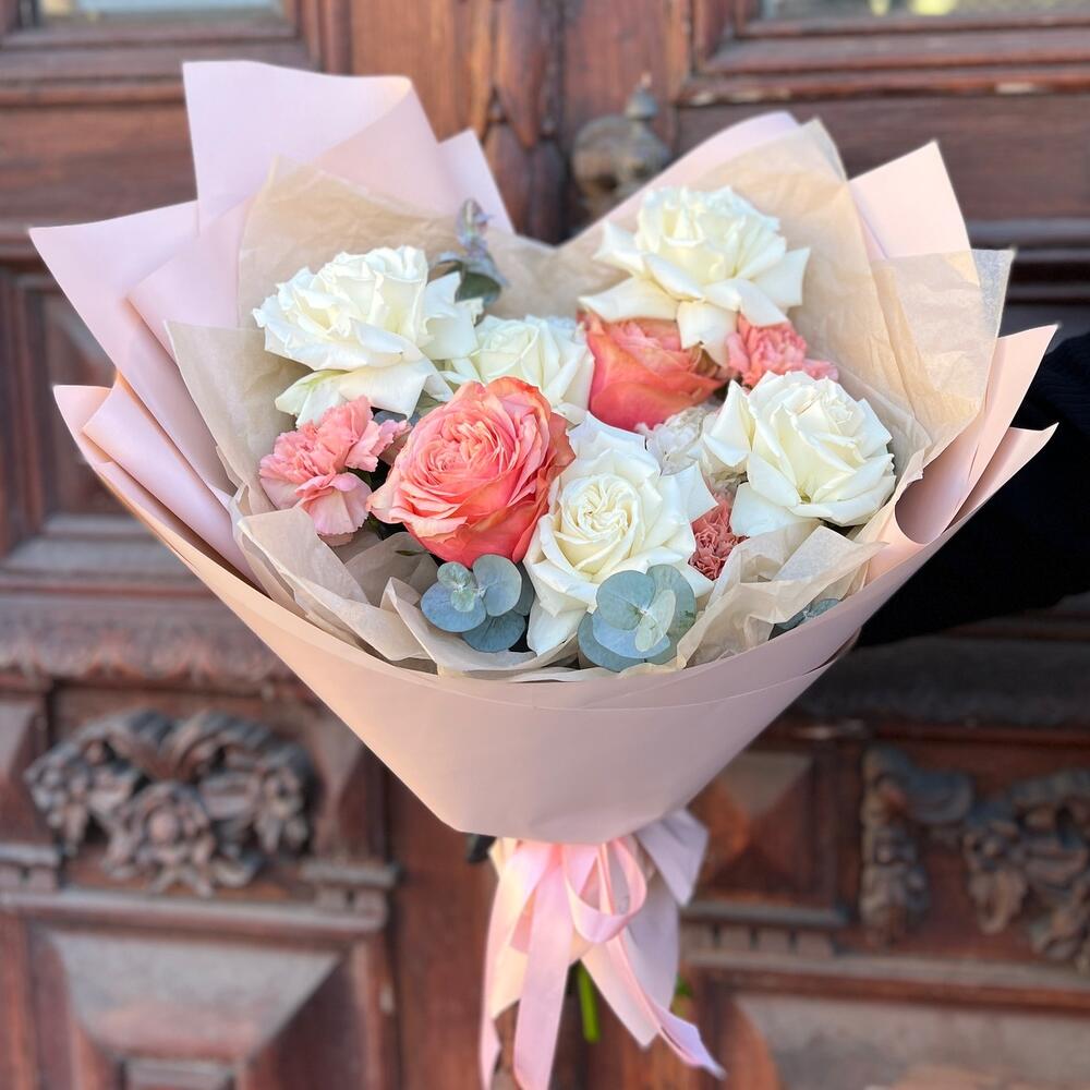 Эвкалипт – 3 шт.Лента атласная – 2 шт.Тишью – 3 шт.Диантус – 6 шт.Пленка матовая – 5 шт.Роза пионовидная кахала – 3 шт.роза пионовидная плайя бланка – 5 шт.