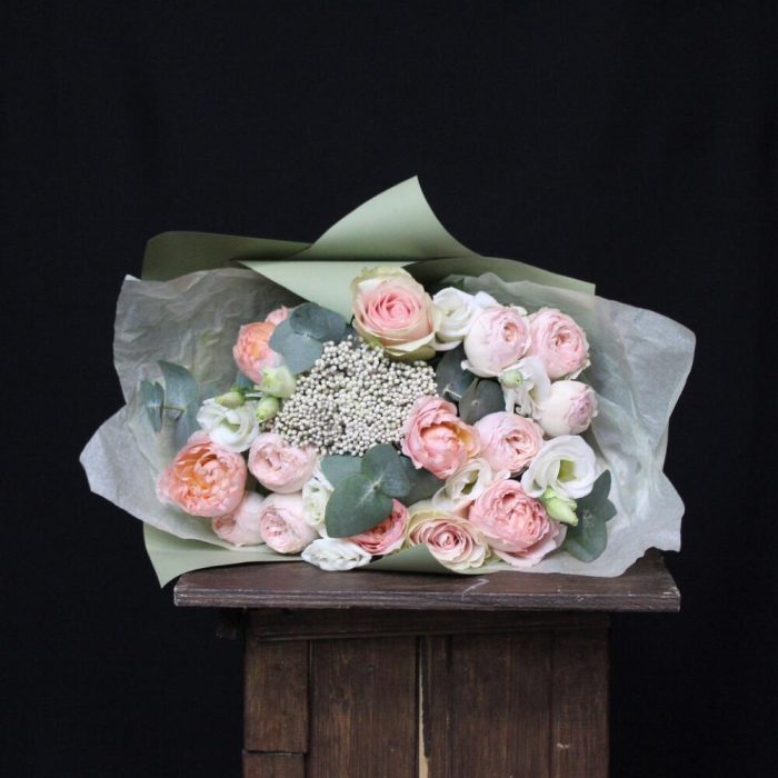 роза эквадор фруттето – 2 шт.Роза кустовая пионовидная джульетта – 1 шт.роза кустовая пионовидная мансфилд парк – 2 шт.Озотамнус – 1 шт.Эвкалипт – 1 шт.Эустома – 2 шт.Тишью – 1 шт.Пленка дизайнерская – 2 шт.