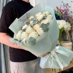 Букет белых пионовидных роз с эвкалиптом – «15 почему я тебя люблю»