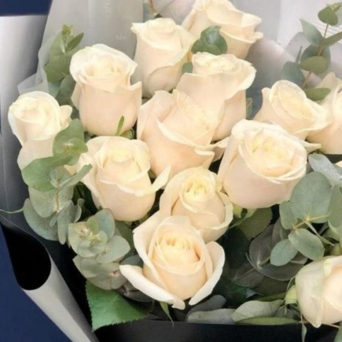 Роза – 15 шт.Упаковка дизайнерская – 3 шт.Лента атласная – 2 шт.зелень декоративная – 2 шт.