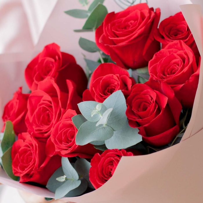 Эвкалипт – 3 шт.красные розы (эквадор) 50 см freedom – 11 шт.