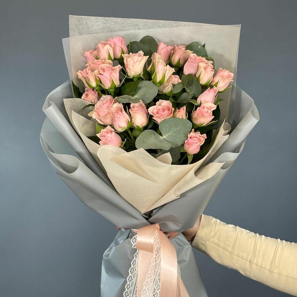 Лента атласная – 2 шт.Упаковка дизайнерская – 2 шт.роза иришка – 5 шт.