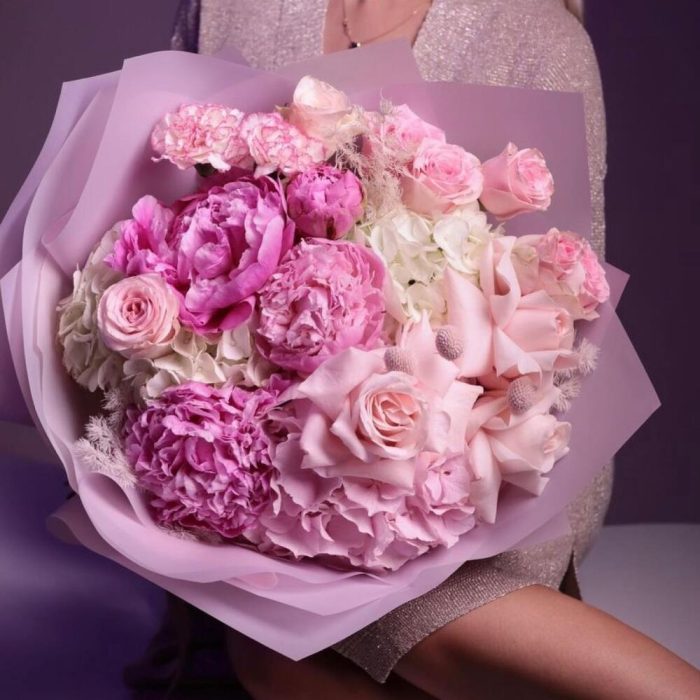 роза ассорти – 9 шт.Гортензия – 4 шт.Пион – 5 шт.Гвоздика – 5 шт.Упаковка дизайнерская – 1 шт.Лента атласная – 2 шт.Открыточка с вашими пожеланиями – 1 шт.хорошее настроение – 100 шт.инструкция по уходу за цветами – 1 шт.коробка переноска – 1 шт.Кризал – 1 шт.