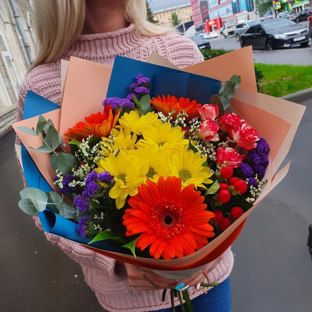 Гербера – 3 шт.Роза кустовая – 1 шт.Хризантема кустовая – 1 шт.Эвкалипт – 1 шт.Статица – 1 шт.Гиперикум – 1 шт.Лимониум – 1 шт.Зелень – 5 шт.Упаковка дизайнерская – 1 шт.
