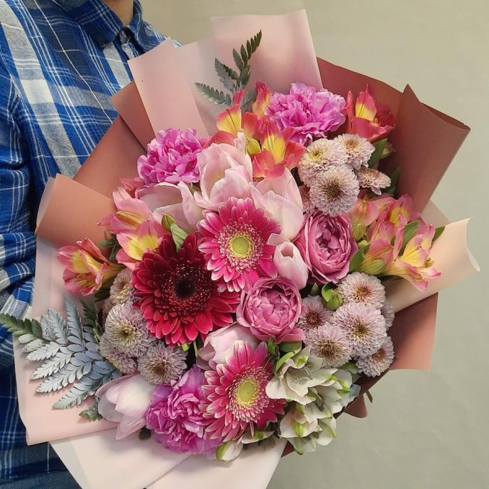 Гермини – 3 шт.Роза кустовая пионовидная – 1 шт.Диантус – 3 шт.Альстромерия – 4 шт.Сантини – 3 шт.Тюльпан – 6 шт.Папоротник – 2 шт.Рускус – 12 шт.Упаковка дизайнерская – 2 шт.Лента атласная – 1 шт.