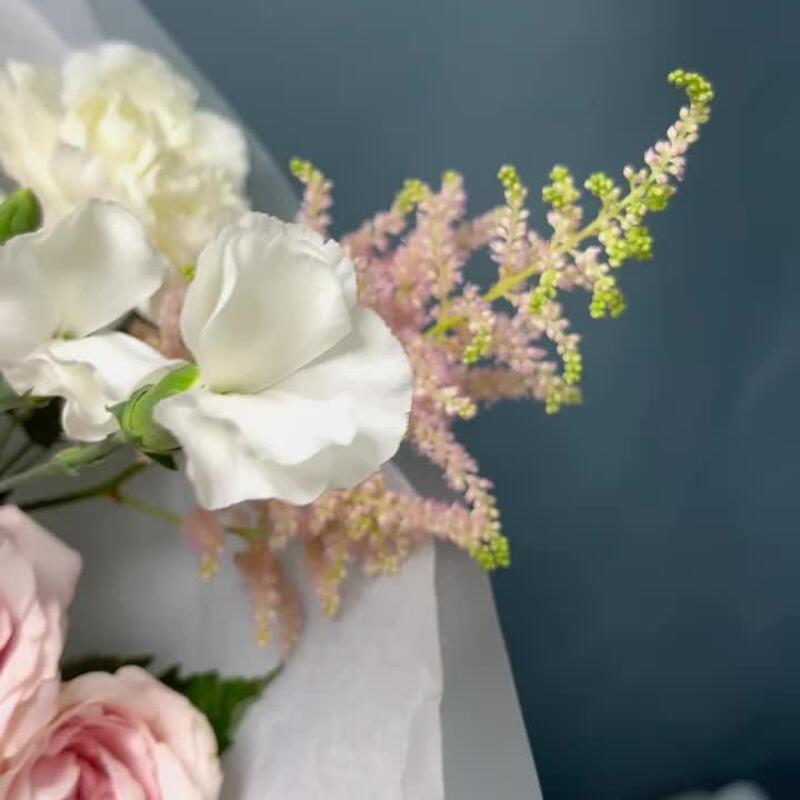 Астильба – 2 шт.Роза кустовая – 2 шт.Эвкалипт – 2 шт.Гвоздика – 3 шт.Лента атласная – 1 шт.Тишью – 1 шт.Кустовая гвоздика – 1 шт.Упаковка дизайнерская – 2 шт.