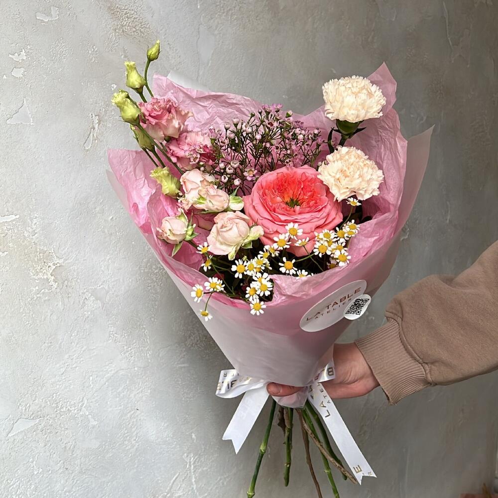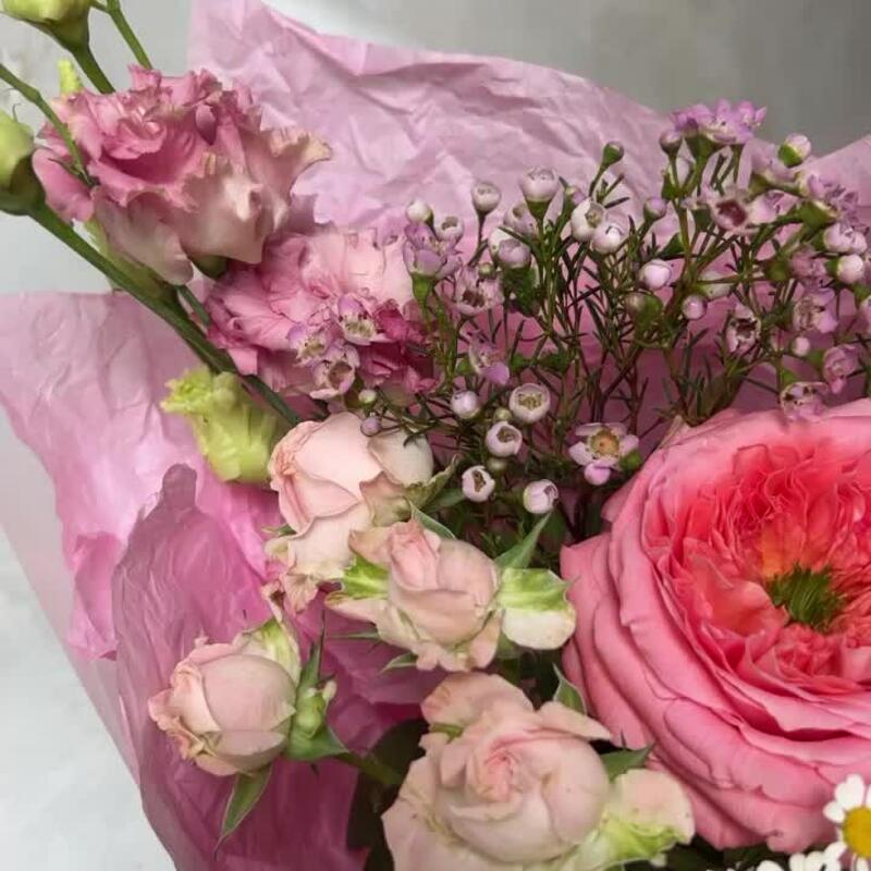 Роза пионовидная – 1 шт.Ваксфлауэр – 1 шт.Роза кустовая пионовидная – 1 шт.Гвоздика – 2 шт.Лизиантус – 1 шт.Матрикария – 1 шт.Упаковка дизайнерская – 1 шт.