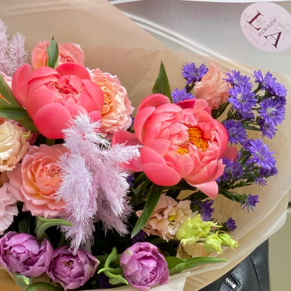 Лизиантус – 1 шт.Гвоздика – 3 шт.Лента атласная – 2 шт.Тишью – 2 шт.Аспарагус – 2 шт.Тюльпан пионовидный – 3 шт.Упаковка дизайнерская – 2 шт.Пионовидная роза кустовая – 1 шт.Фисташка пучок – 2 шт.Астра кустовая – 2 шт.Пион коралл шарм – 2 шт.