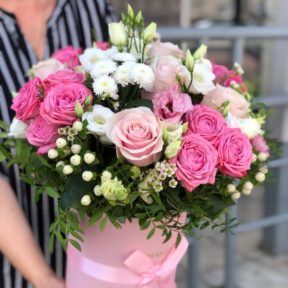 Гиперикум – 5 шт. Писташ – 5 шт. Роза – 7 шт. Хризантема – 1 шт. Эустома – 5 шт. Хамелациум – 3 шт. Кустовая пионовидная роза – 4 шт. Шляпная коробка с лентами – 1 шт.