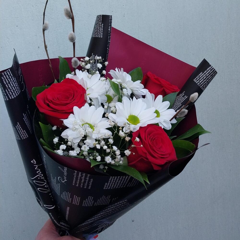 Роза Эквадор – 3 шт.Лента атласная – 1 шт.Упаковка дизайнерская – 4 шт.Рускус сочи – 10 шт.гипсофила белая – 1 шт.верба натуральная – 3 шт.бакарди ромашка хризантема кустовая – 1 шт.