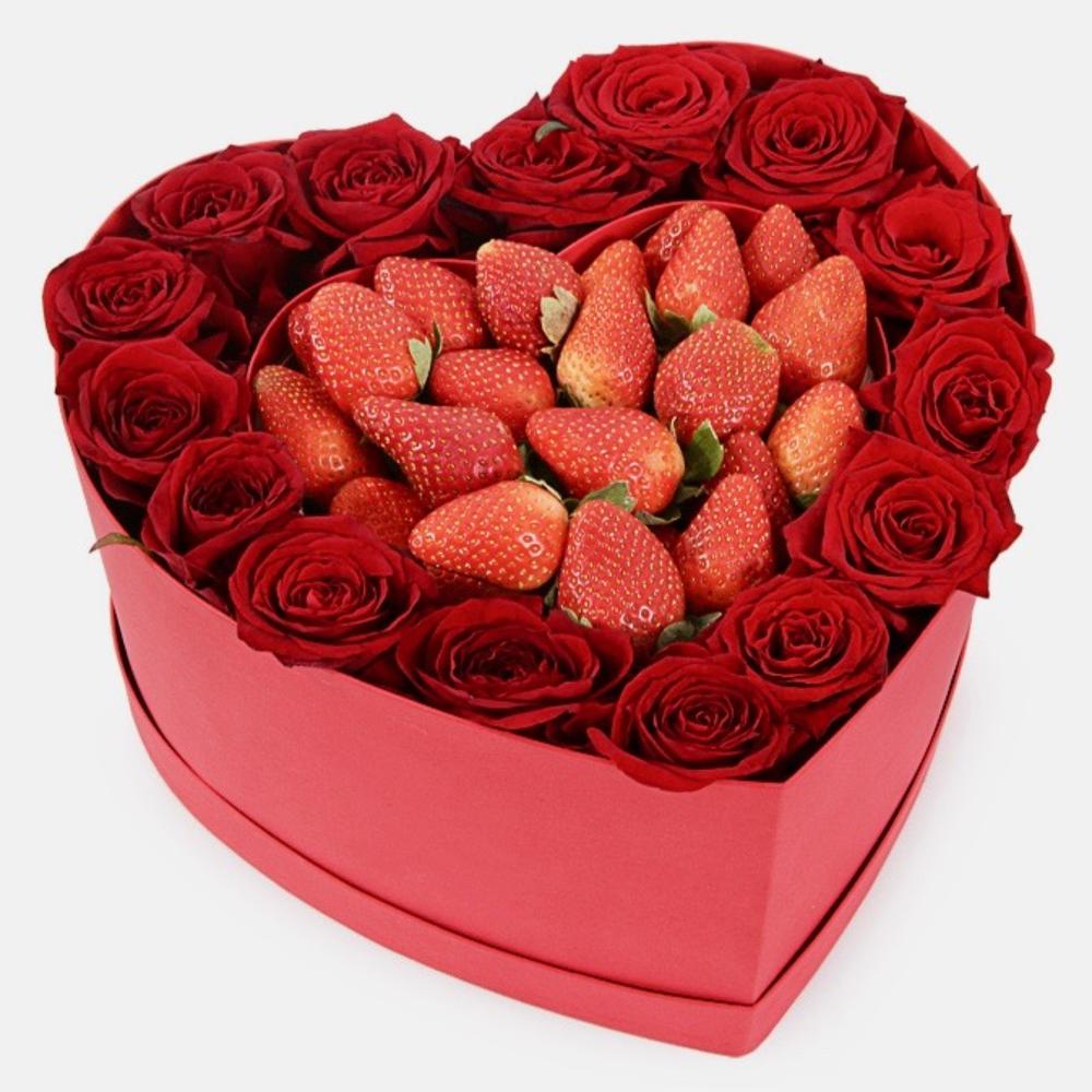Клубника – 500 гр.Роза красная – 15 шт.Коробка сердце – 1 шт.Оазис флористический – 2 шт.