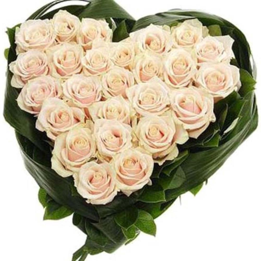 Роза кремовая 60 см – 25 шт.Аспидистра – 10 шт.Салал – 15 шт.Пиафлор (оазис) в форме сердца – 2 шт.Упаковка пленка – 1 шт.Лента атласная – 1 шт.Упаковка фетр – 2 шт.