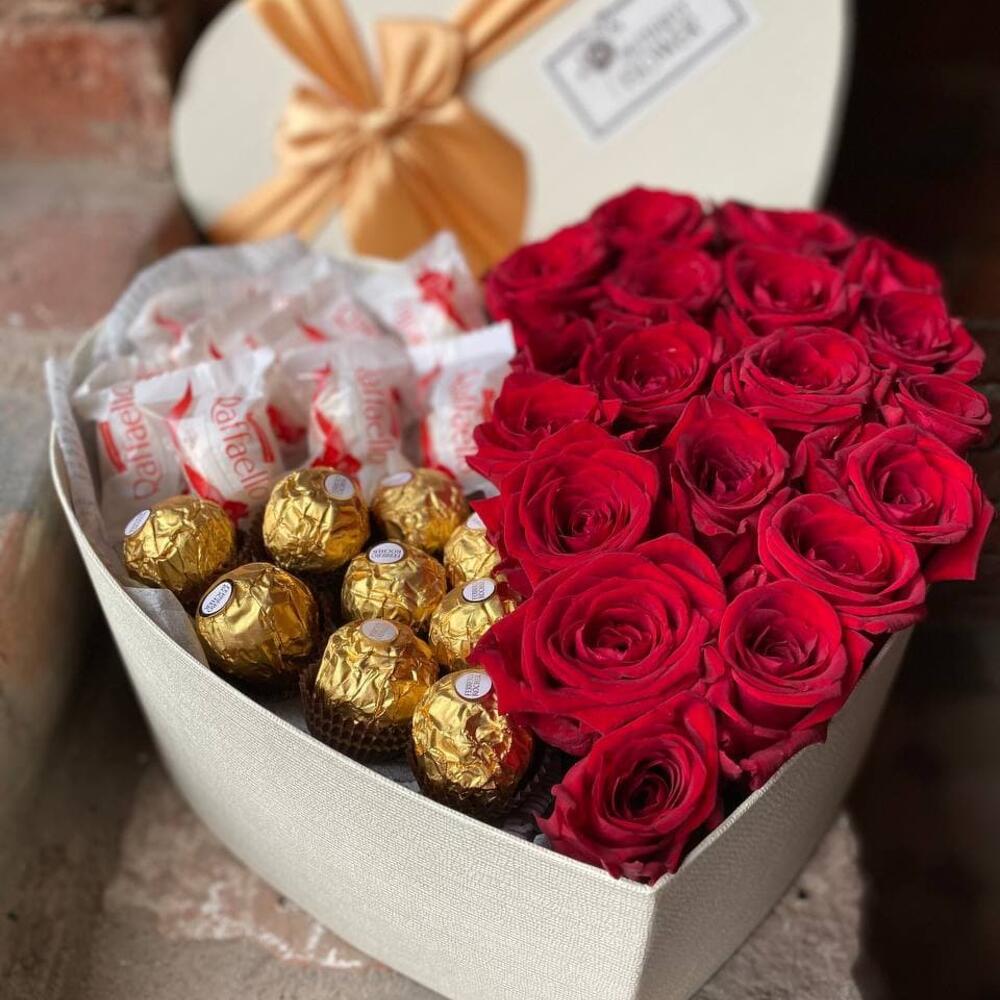 Композиция из роз, рафаэлло и ферреро “Сладкий вкус любви”