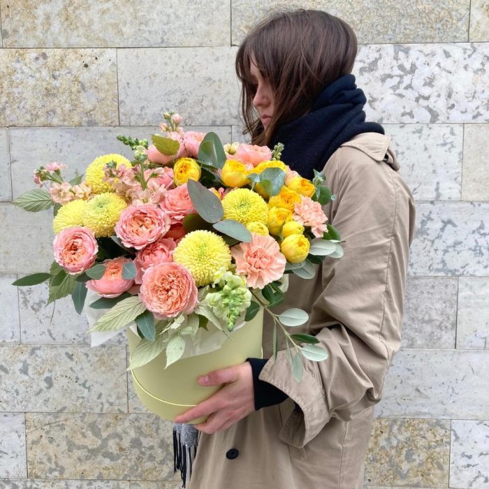 Роза пионовидная кустовая – 7 шт.Хризантема – 5 шт.Маттиола – 7 шт.Львиный зев – 3 шт.Эвкалипт – 7 шт.Ветки малины – 3 шт.Тишью – 2 шт.Шляпная коробка – 1 шт.Оазис флористический – 1 шт.
