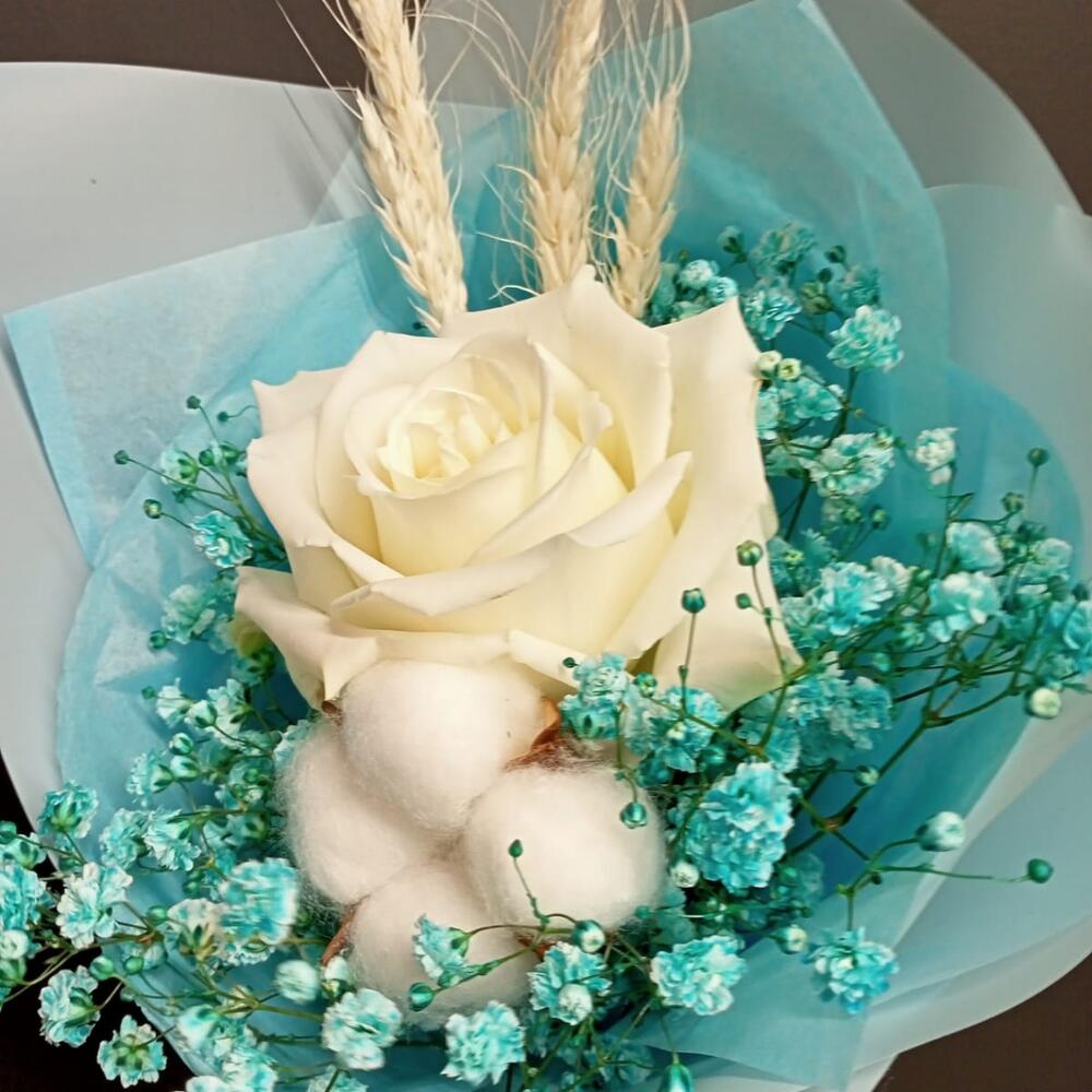 Роза – 1 шт.Гипсофила – 1 шт.Колоски – 5 шт.Упаковка дизайнерская – 1 шт.Хлопок натуральный – 1 шт.