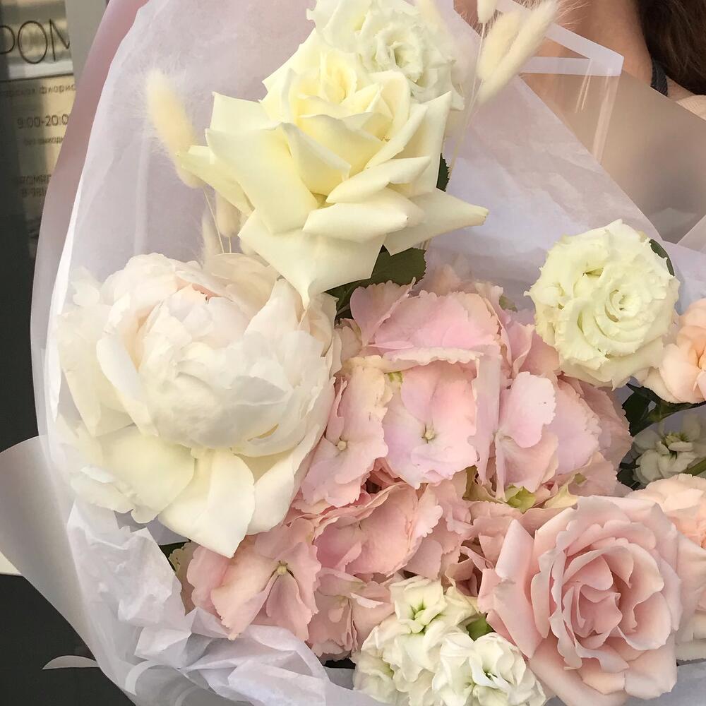 Гортензия – 1 шт.Пион – 1 шт.Роза – 3 шт.Лизиантус – 2 шт.Маттиола – 2 шт.Лагурус – 2 шт.Упаковка дизайнерская – 1 шт.
