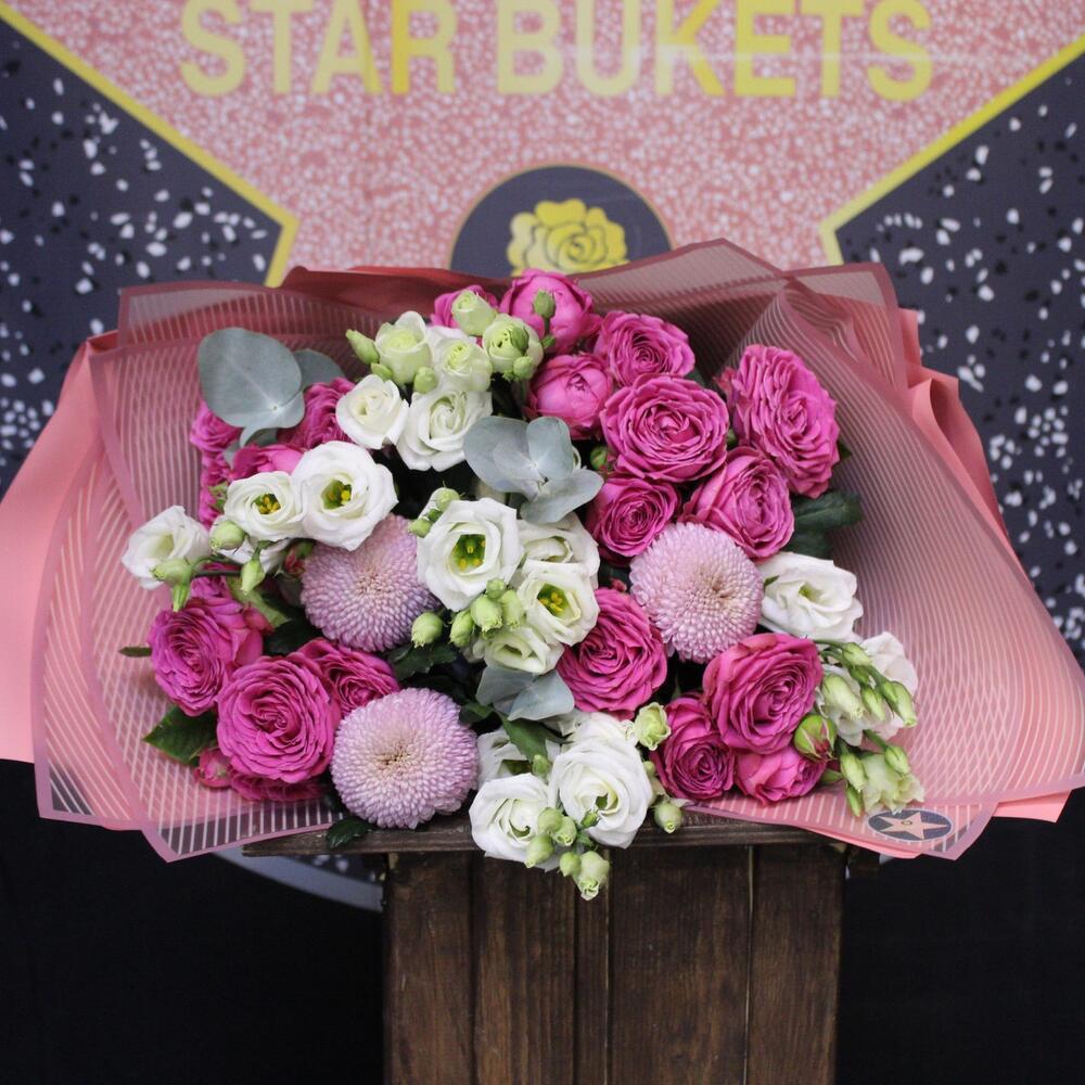Категорий: Кустовые розы, Лизиантусы, Пионовидные розы, Розы, Хризантемы