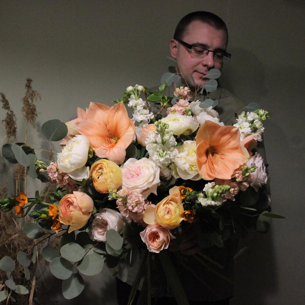 Персиковый - Букет с пионами, ранункулюсами и амариллисами