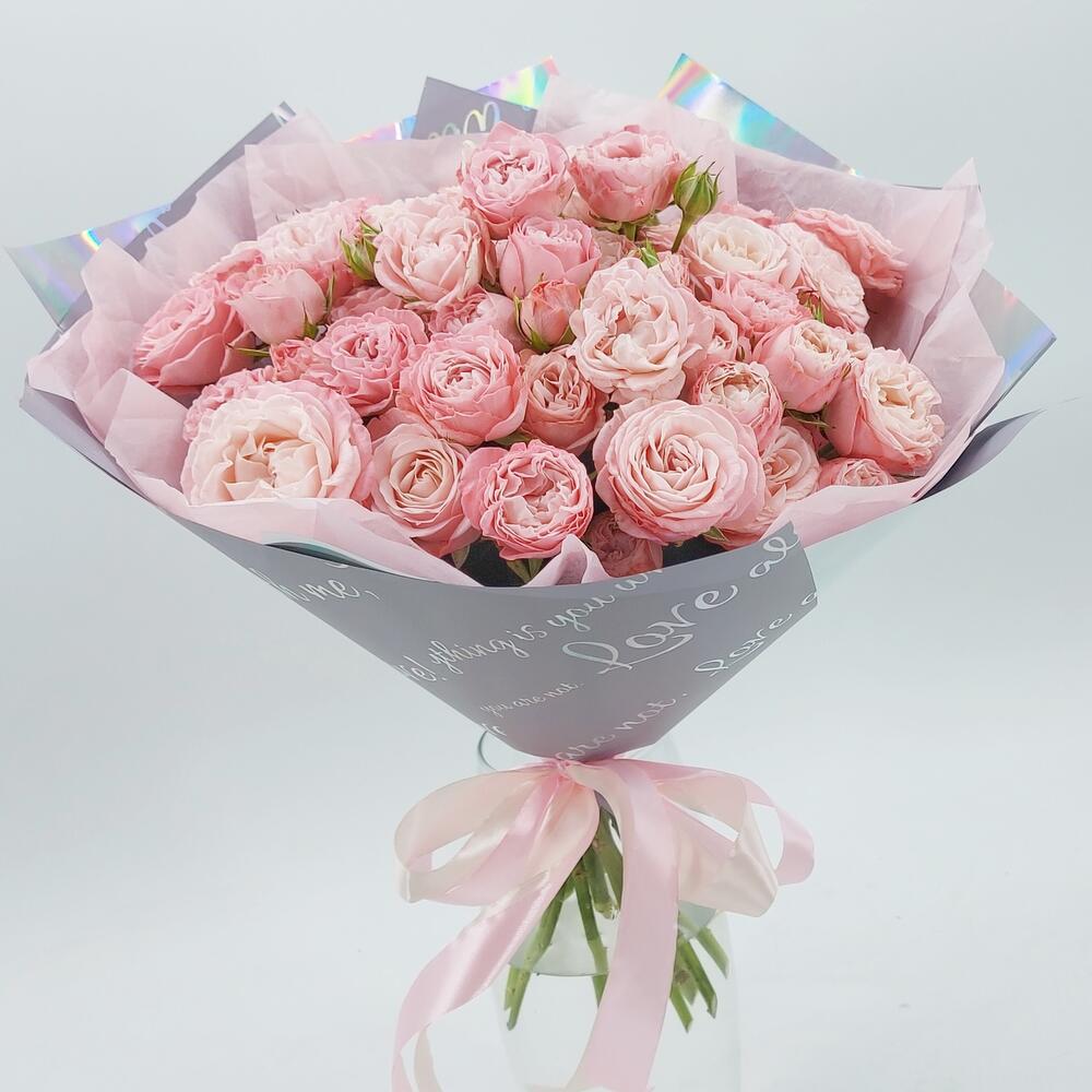 Нежные, пышные пионовидные кустовые розы Бомбастик в стильном, лаконичном монобукете – универсальный выбор по любому поводу или вовсе без повода. Можно преподнести маме, сестре, подруге, коллеге, любимой.