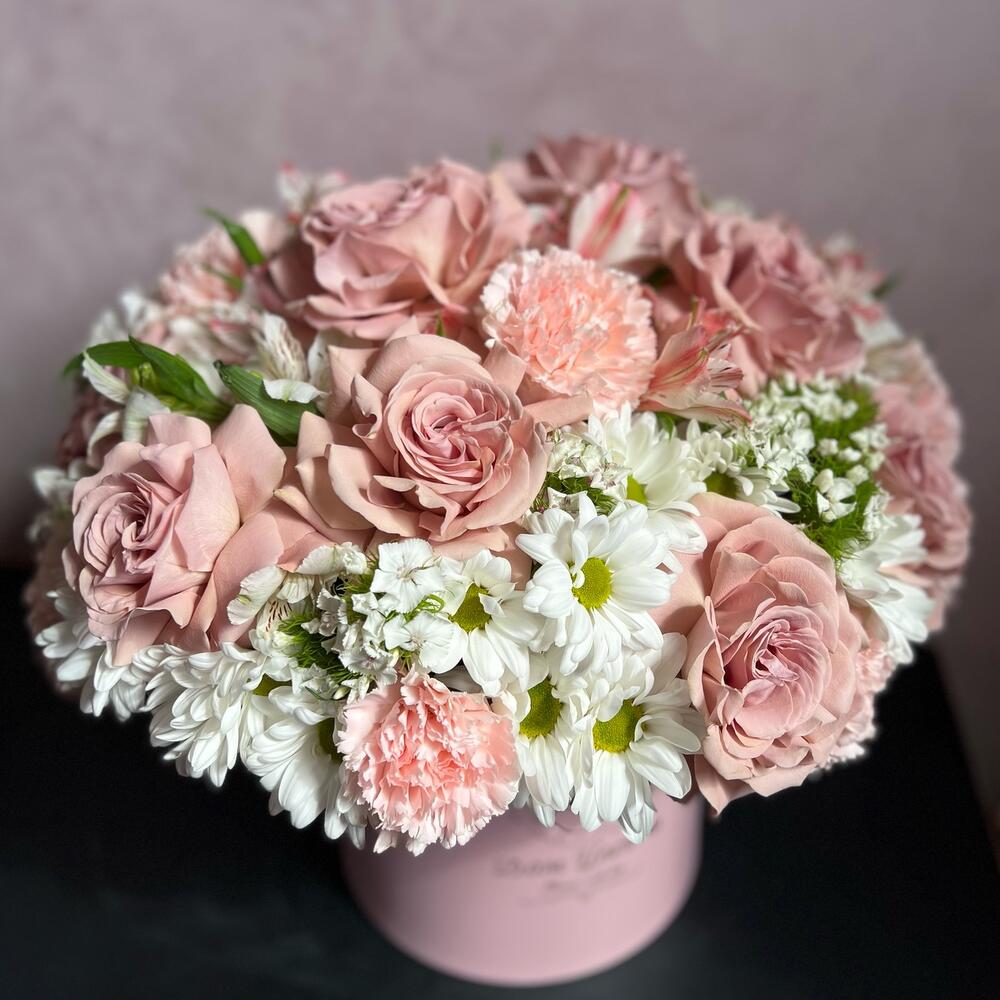 Шляпная коробка с лентами – 1 шт.Флористическая губка (оазис) – 1 шт.Пионовидная роза – 15 шт.Альстромерия – 5 шт.Кустовая хризантема – 10 шт.