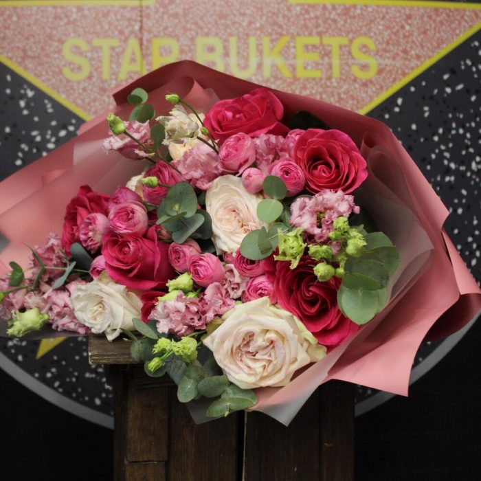 Роза Pink Floyd – 6 шт.white o’hara – 3 шт.giselle роза – 4 шт.mansfield park – 1 шт.эустома alissa pink – 4 шт.Эвкалипт – 3 шт.Пленка матовая – 6 шт.Лента атласная – 2 шт.
