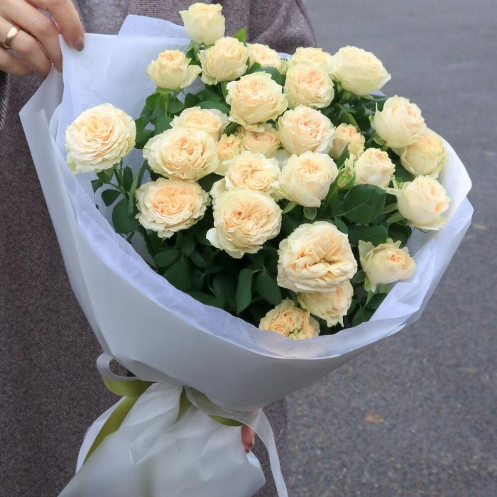 Пионовидная кустовая роза с легким цветочным ароматом.