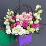Коробка Трогательные чувства из эустомы и пионовидных роз