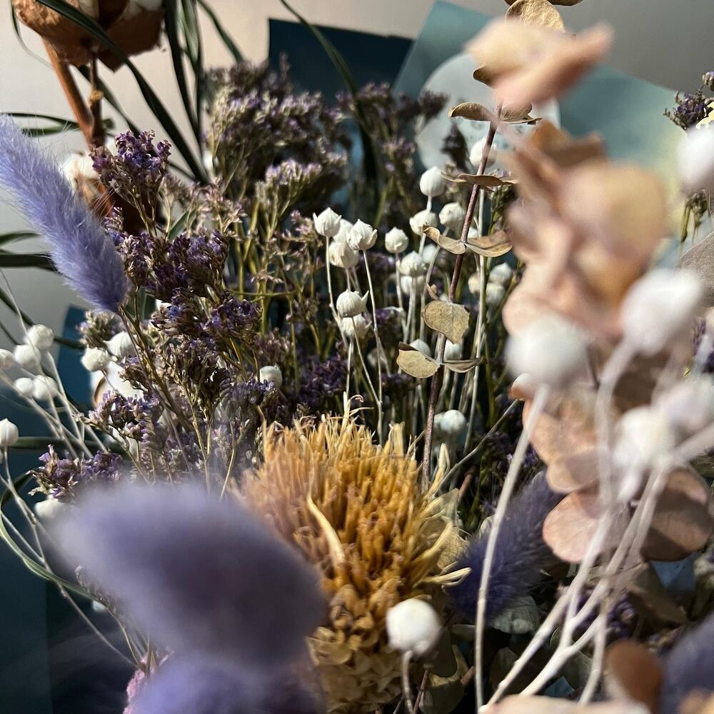 Хлопок ветка – 1 шт.амарант сухоцвет – 1 шт.Лагурус (сухоцвет) – 11 шт.Эвкалипт сухоцвет – 5 шт.пальма сухоцвет – 1 шт.лен сухоцвет – 5 шт.лимониум сухоцвет – 5 шт.артишок сухоцвет – 1 шт.Пленка матовая – 3 шт.Лента атласная – 1 шт.